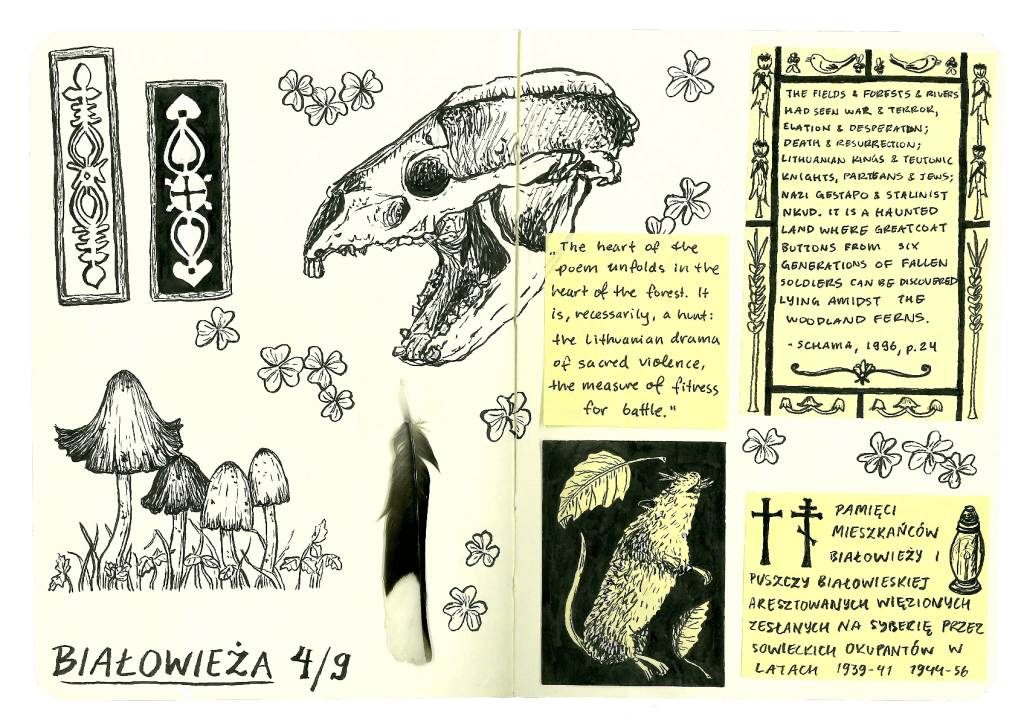 It felt like Białowieża Forest had been on the lips of every other researcher I met since I first moved across the Atlantic. Dense piles of peer-reviewed articles, books, and newspaper headlines brandishing its name flashed out at me, an endless stream of stories and insights and concerns. It would be a lifetime of reading to parse through it all. Who was I to come here? An artist living in the area who I spoke to over a scratchy video call months earlier told me how many years it took her to finally feel like she knew Białowieża Forest. And of the many artists who come and go, hoping to make a project about the forest in a few short weeks. Las się śmieje wtedy, she said. “The forest laughs then.” How was I doing anything different, I thought— was the forest laughing at me now? And what does it mean to know a forest?